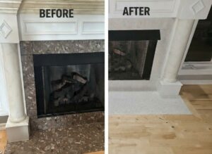Our coating is heat and water resistant. That being said we cannot warranty your use of the fireplace as there is a difference between heat resistant and heat proof. So this is recommended for cosmetic use only. Which doesn’t mean the coating won’t last a long time it likely will. But we can’t guarantee that it won’t be damaged if you actually use the fireplace on a regular basis. If damage did occur it could be repaired easily and would be covered by the warranty with a deductible. As it would not be an issue of our workmanship in those instances a deductible would apply. Most of our competitors warranties wouldn’t even cover it with a deductible. They’d make you pay the full retail price to have it redone.